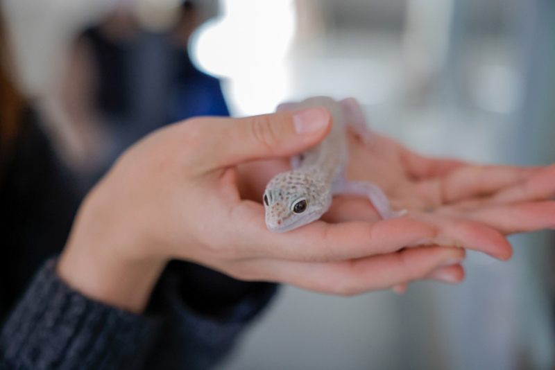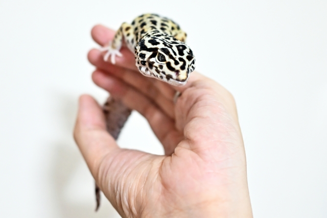 人に慣れたレオパは、自ら飼育者の手や体に登ってくることも。その場合も急激に持ち上げるのではなく、そっとハンドリングしましょう。