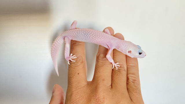 | ブリザード | 模様も入らず全身がほぼ白一色の個性的なレオパです。 時間の経過とともに色味に変化が現れることがあり、黄色みが強くなったり真っ黒になったりなど、成長後の姿に個体差があります。 |