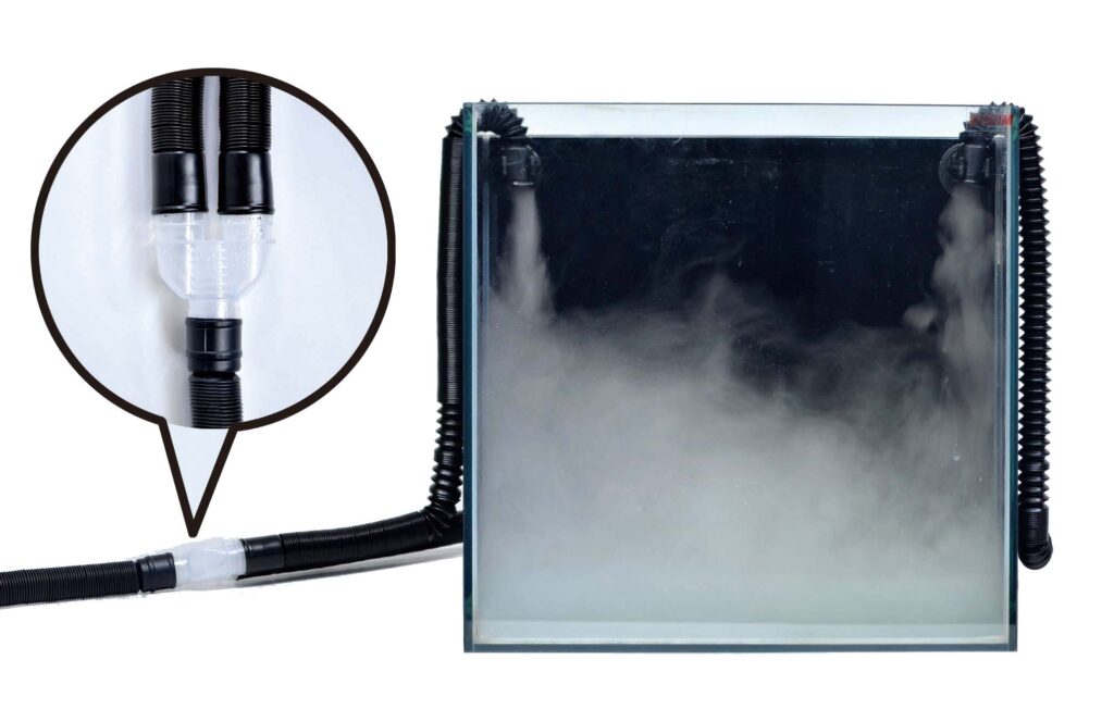 この蛇腹ホースがあることで、ケージのサイズ問わずにミストを送り込むことが可能となっています。